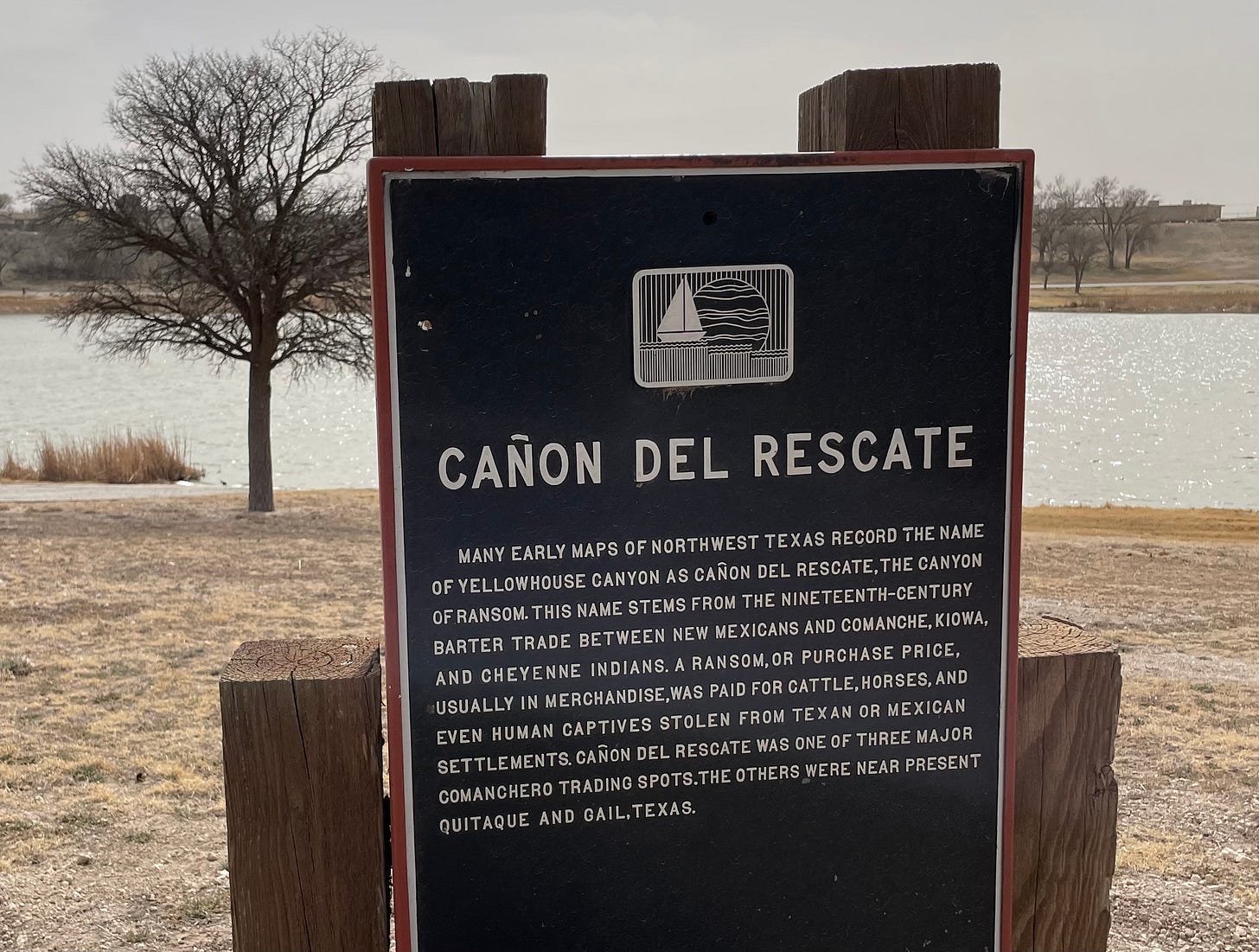 “MANY EARLY MAPS OF NORTHWEST TEXAS RECORD THE NAME OF YELLOWHOUSE CANYON AS CAÑON DEL RESCATE, THE CANYON OF RANSOM. THIS NAME STEMS FROM THE NINETEENTH-CENTURY BARTER TRADE BETWEEN NEW MEXICANS AND COMANCHE, KIOWA, AND CHEYENNE INDIANS. A RANSOM, OR PURCHASE PRICE, USUALLY IN MERCHANDISE, WAS PAID FOR CATTLE, HORSES, AND EVEN HUMAN CAPTIVES STOLEN FROM TEXAN OR MEXICAN SETTLEMENTS. CAÑON DEL RESCATE WAS ONE OF THREE MAJOR COMANCHERO TRADING SPOTS.”
